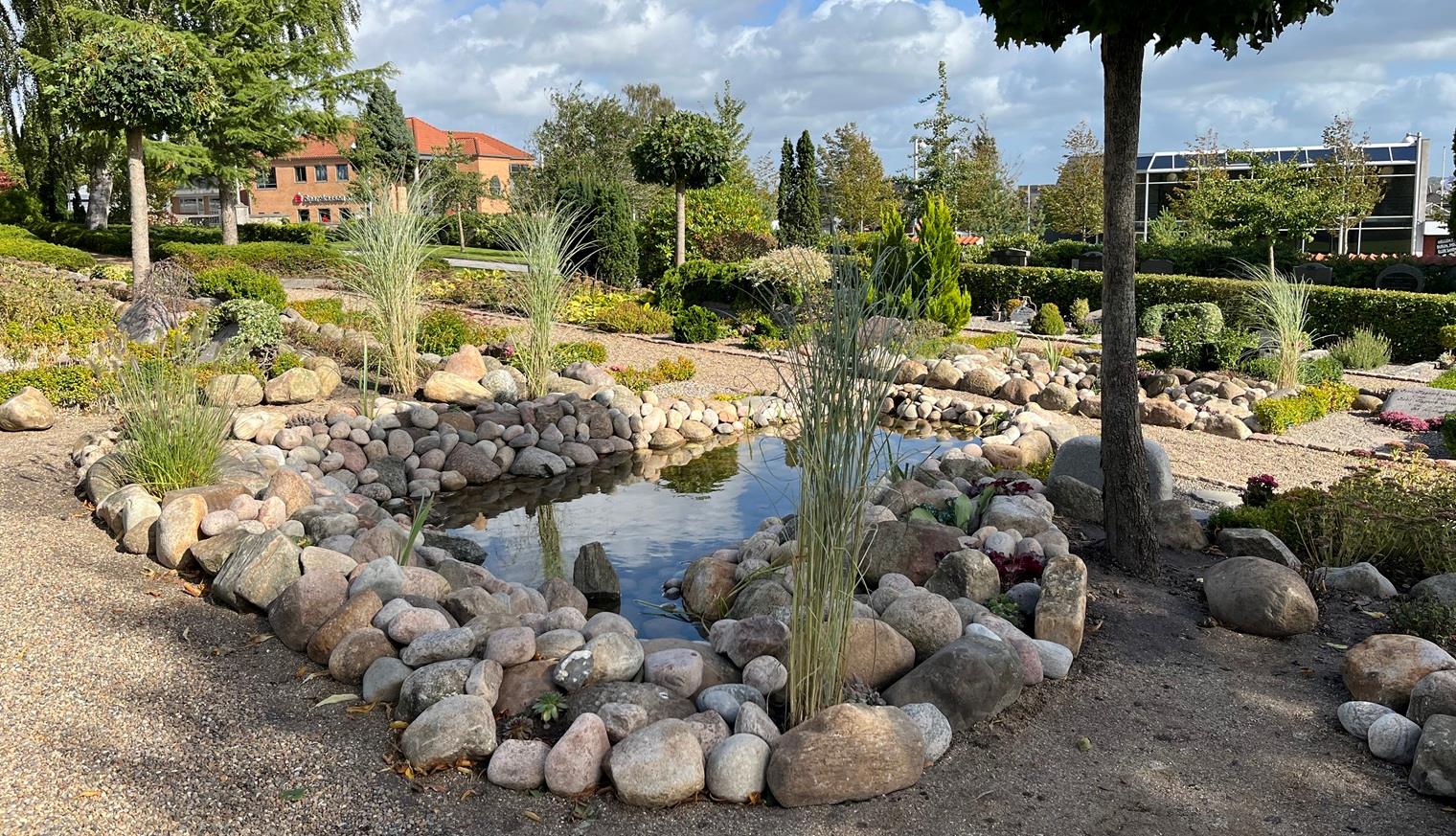 Smukt spejlbassin lavet i ramme fra et sløjfet gravsted på afdeling 21. Skiffer fra Skive kirkes gamle tag er påsat siderne. Toppen er lærkeplanker.